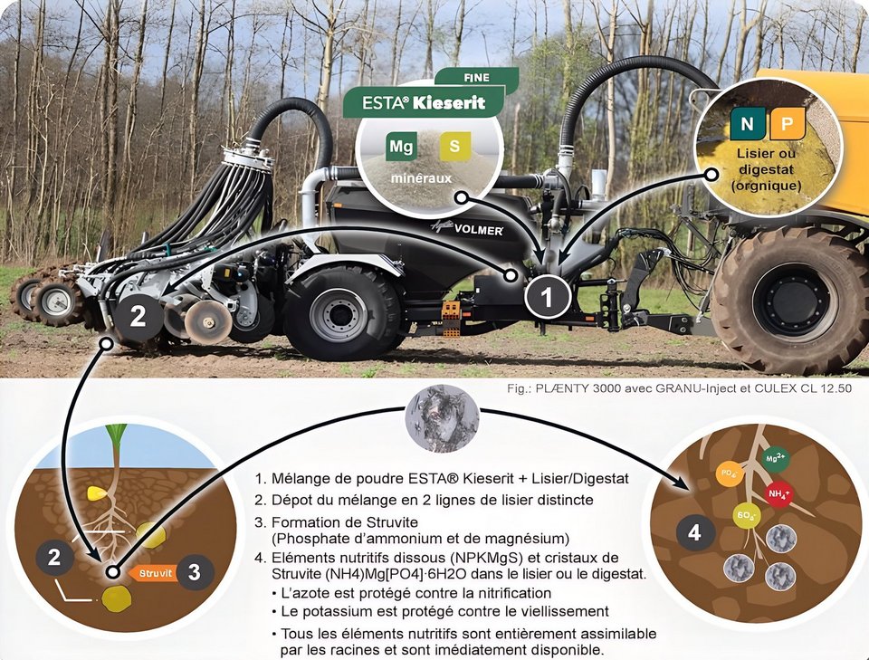 L'idée est de faire pousser des cristaux de struvite dans la bande de lisier avec le magnésium de la kiesérite et l'ammonium et le phosphore du lisier.